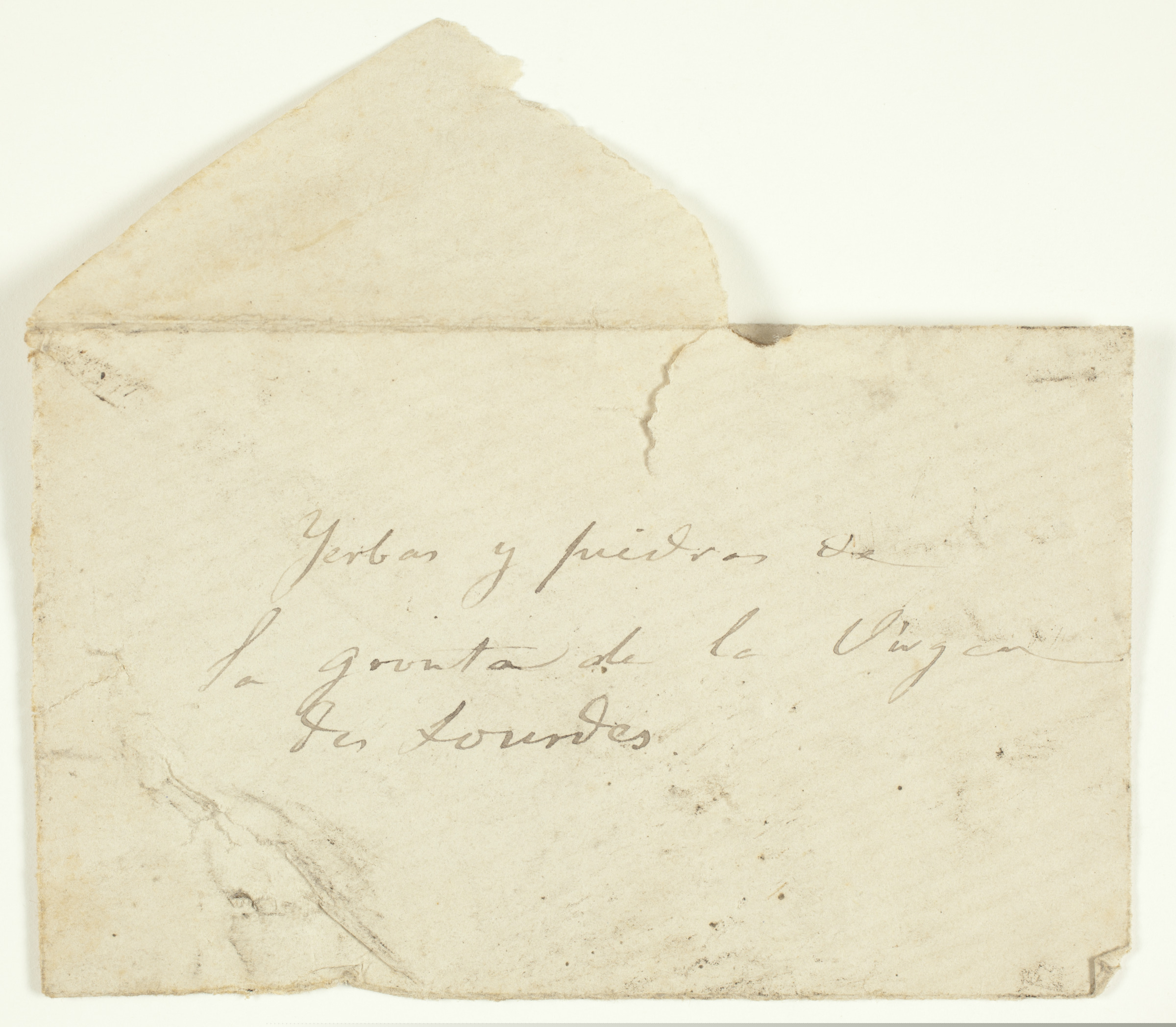 | Sobre: restos vegetales en su interior | Yerbas y piedras de la gruta de la Virgen de Lourdes [ms. r.] |