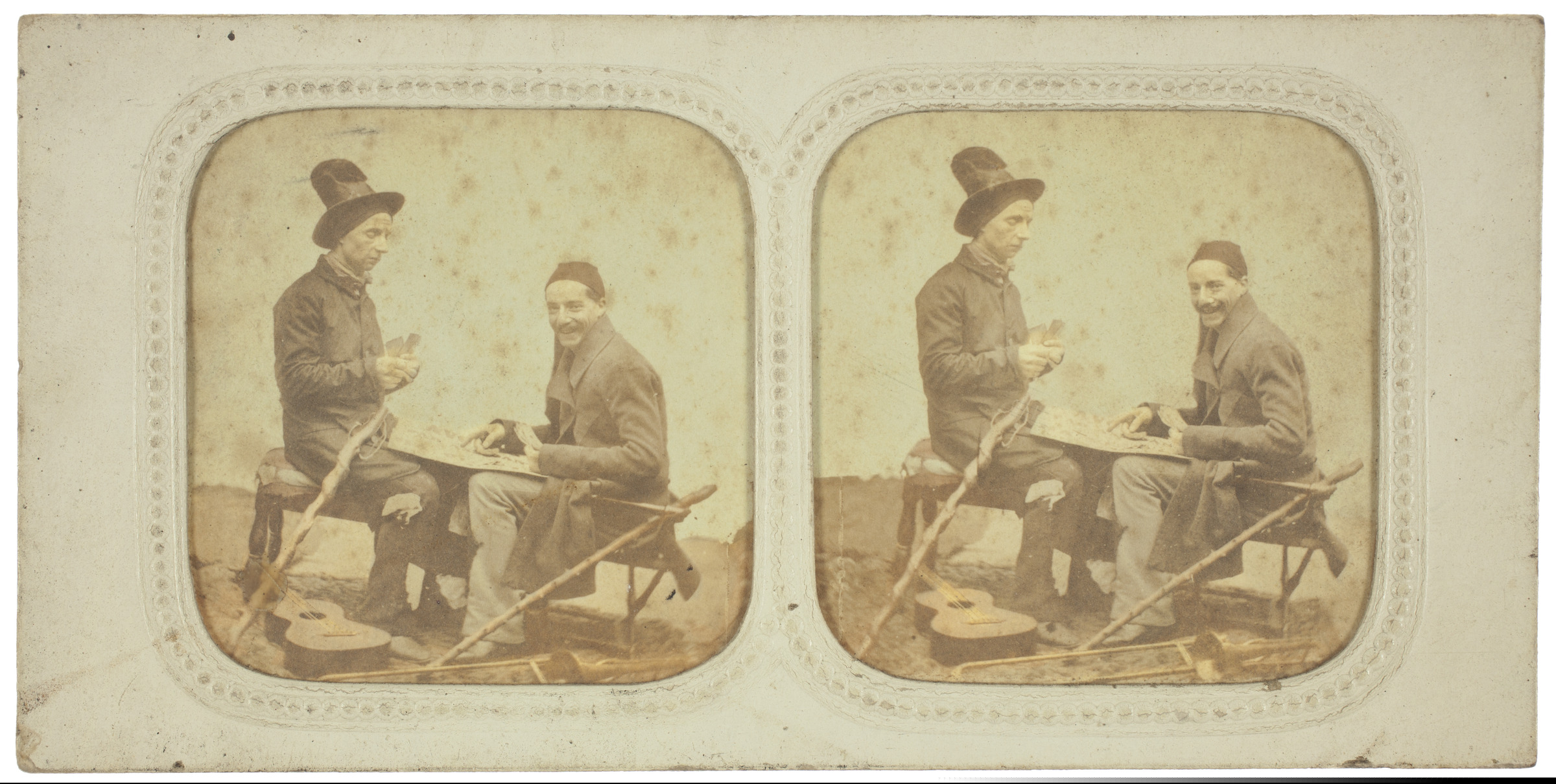 | Retrato de dos hombres jugando a las cartas; guitarra en el suelo |