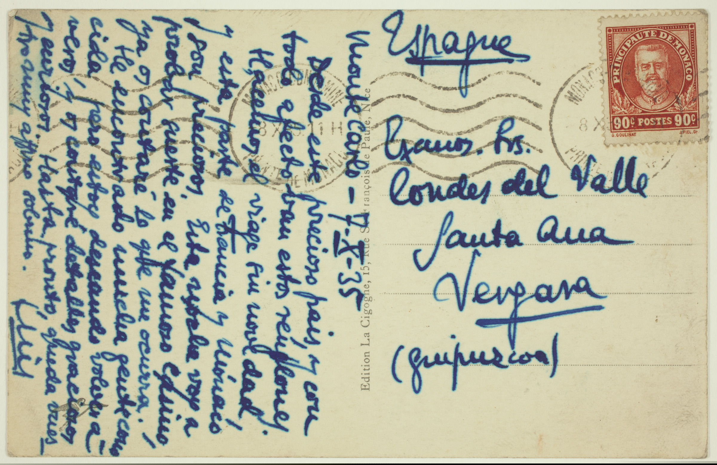 Vista de Monaco | 1426 - Principauté de Monaco. Le port et Monte-Carlo. - Vue sur Cap Martin [imp. r.]; Montecarlo - 7-X-35, Desde este precioso pasi, y con todo afecto van estos renglones. Hacemos el viage sin novedad, y esta parte de Francia y Mónaco son preciosos. Esta noche voy a probar suerte en el famoso casino, ya os contaré lo que me ocurra. He encontrado mucha gente conocida, pero estoy deseando volver a veros y os contaré detalles graciosos y curiosos. Hasta pronto, queda vuestro muy affmo. sobrino [sinadura:] Luis. Espagne. Excmos. Srs. Condel del Valle, San Ana. Vergara (Guipúzcoa) [ms. v.] |