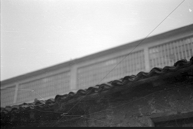 | Tejados: detalle de un tejado de teja en primer plano, ventanas de taller en segundo plano |