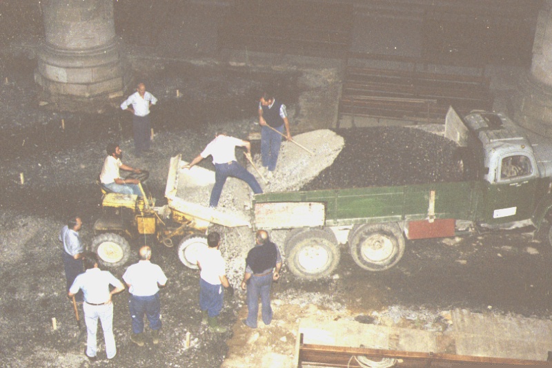 | Grupo de hombres descargando el camión en el interior de la iglesia de Santa Marina |