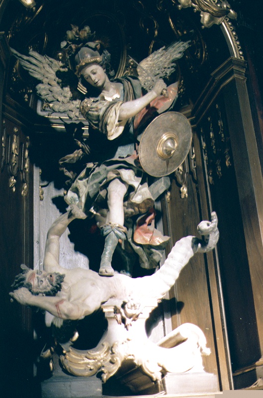 Imagen del arcángel situado en el retablo de San Miguel de la iglesia de Santa Marina. |