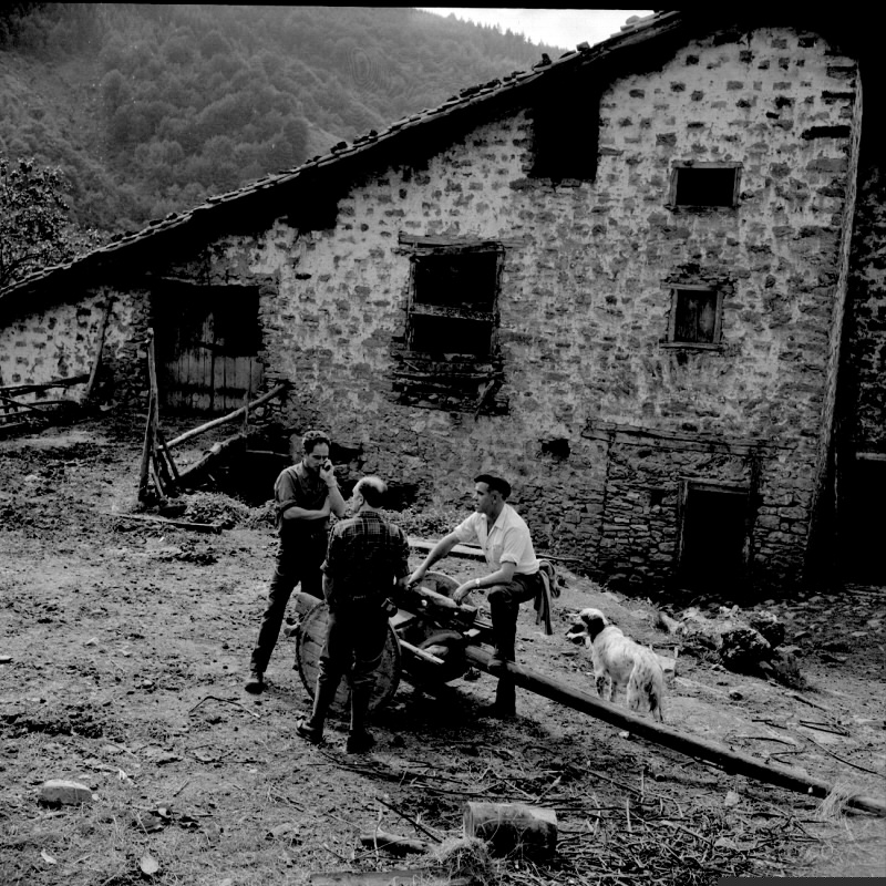 | Grupo de hombres alrededor del carro frente al caserío |