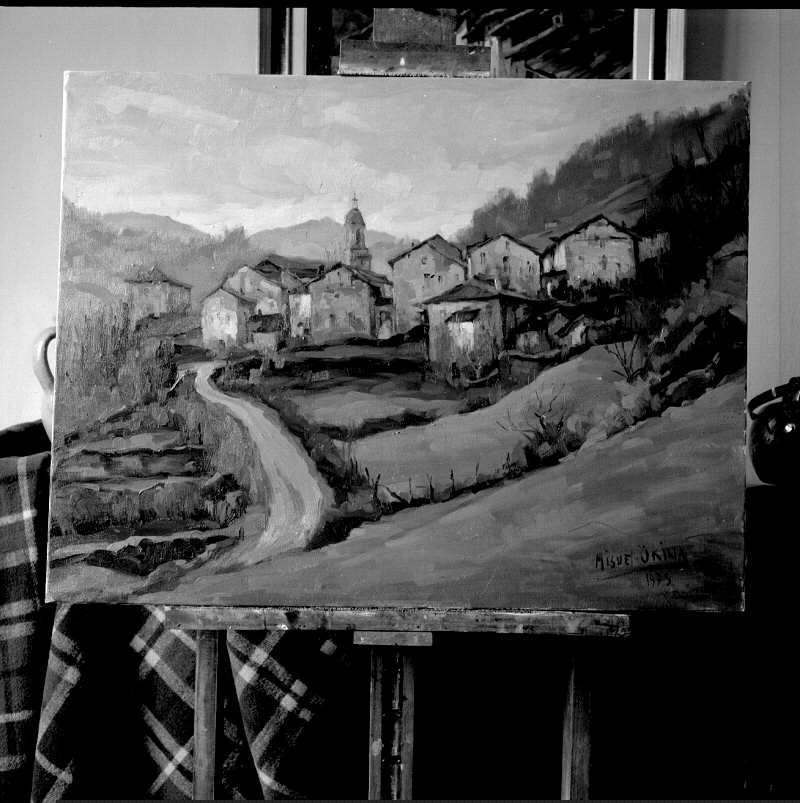 | Cuadro: aldea [firma: Miguel Okina, 1975] |