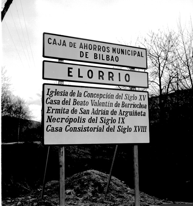 | Señal de tráfico con la lista de monumentos de Elorrio |