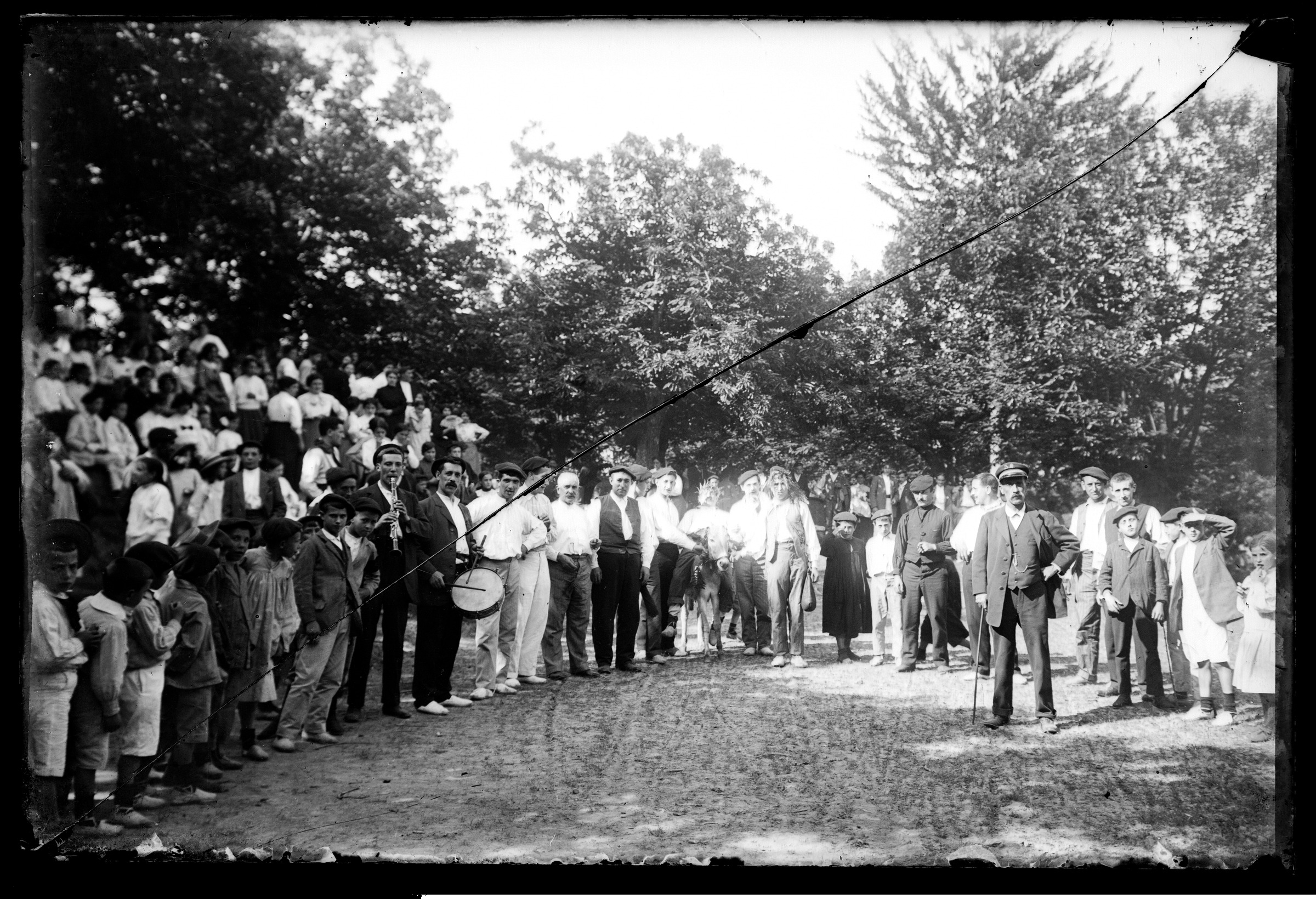 | Romería en la campa de San Marcial; a la izquierda tambores y txistularis; a la derecha alguacil |