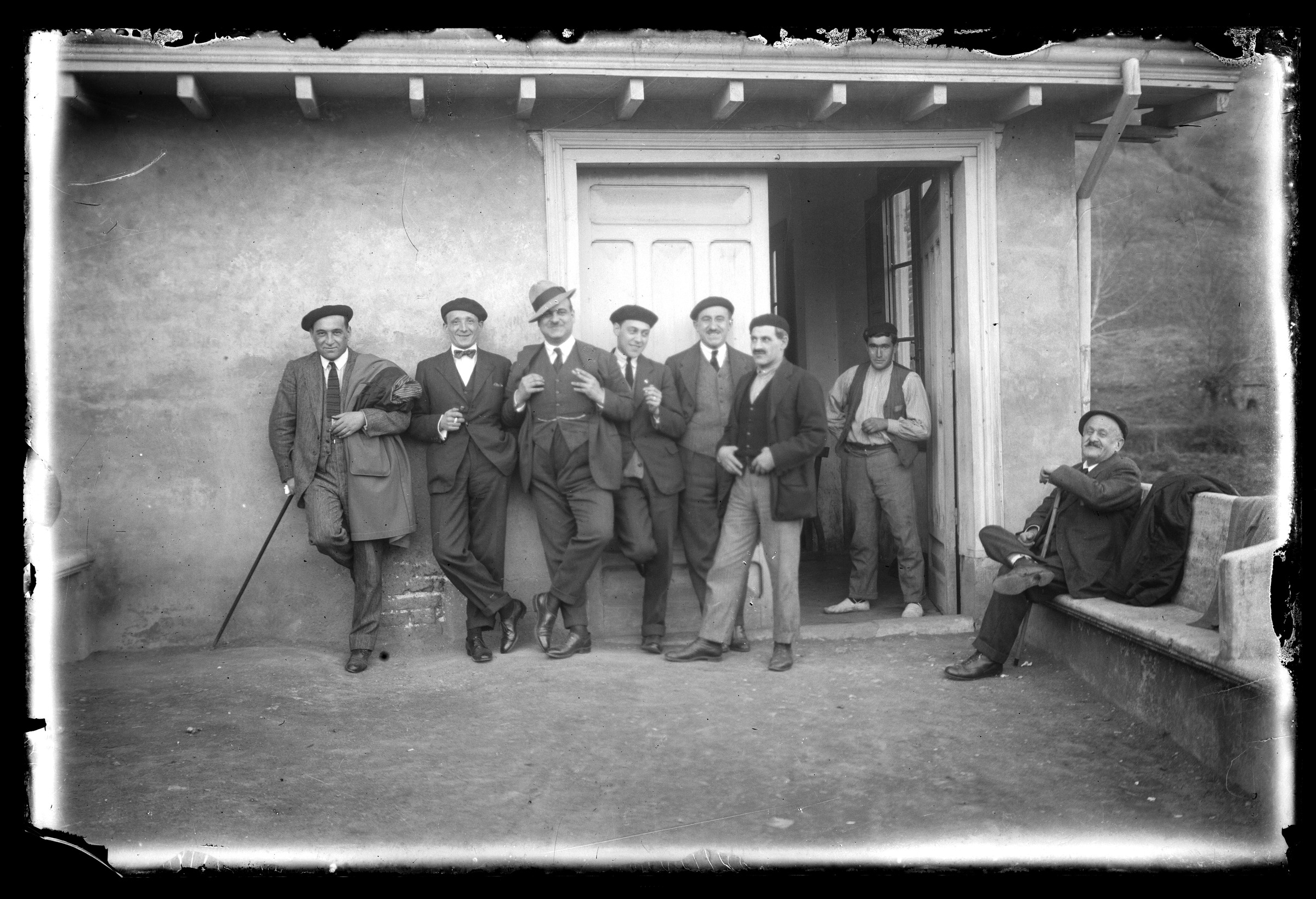 | Cuadrilla de hombres (8 personas) delante de una casa | [Recuerdos de Eguino. Personajes muy conocidos y distinguidos de la villa: Idarreta, Etxaniz, Don Pantaléon, Zabala, Mendibil, Narbaiza, etc. Año 1916] |