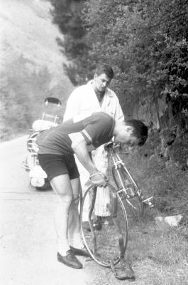 | Ciclista arreglando la rueda en la carrera |