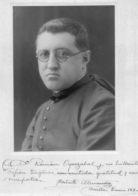 | Retrato de hombre | A Dn. Román Oyarzabal y su brillante "Orfeón Vergarés", con sentida gratitud y cordial simpatía [sinadura:] Norberto Almandoz, Sevilla Enero 1950 [ms.r.] |