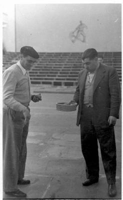 | Dos hombres en el frontón: uno probando las pelotas y el otro tiene la cesta de las pelotas | Fotocar, Fuenterrabía 6, S. Sebastian [imp.v.] D/495 [ms.v.] |