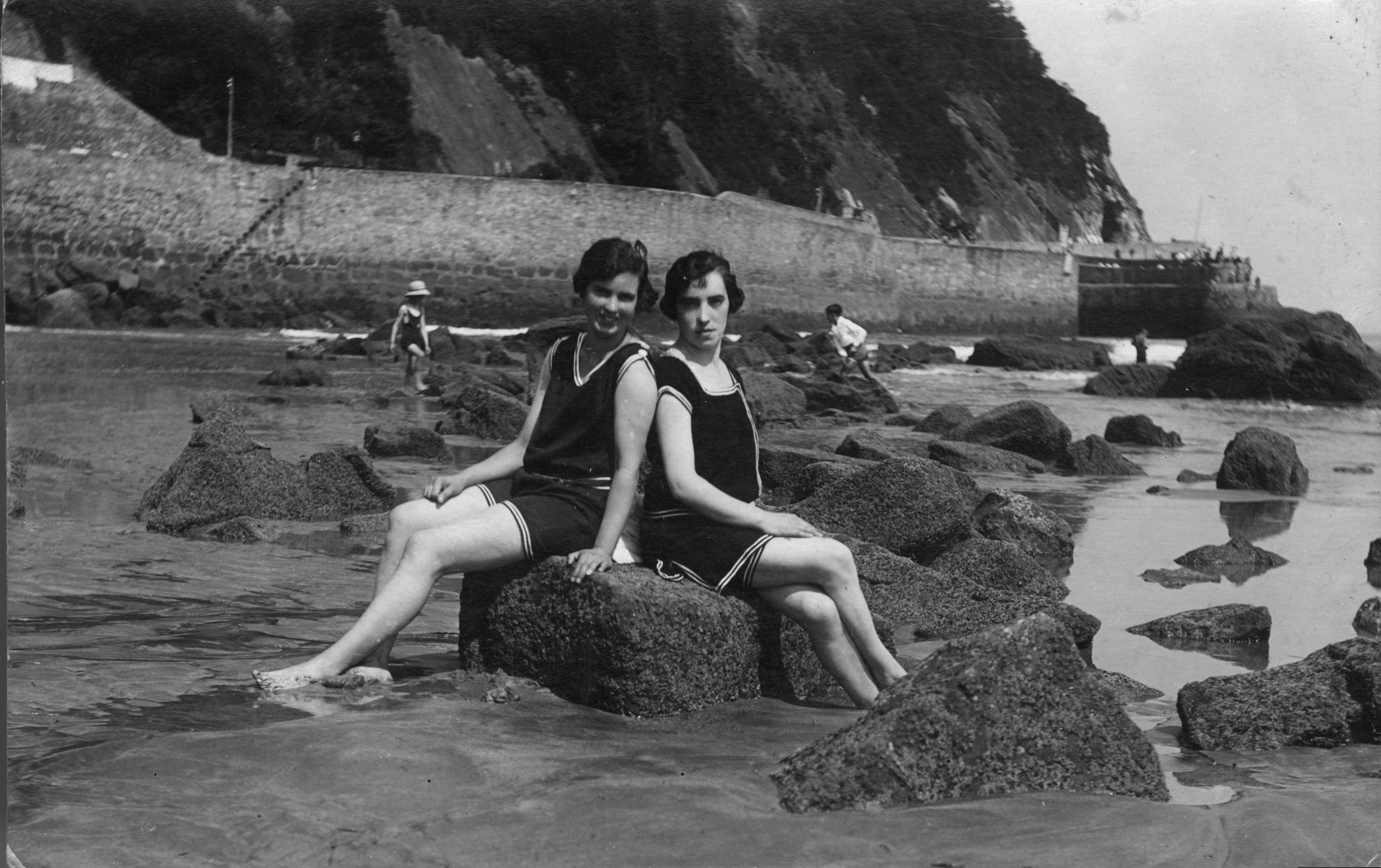 | Dos mujeres sentadas sobre en una piedra en la playa de Zarautz |