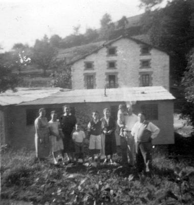 | La familia Azkarate Arizabaleta frente al caserío Amillaga Etxeberri: detrás del grupo y frente al caserío se ve el aserradero de Rufino Garmendia, frente al cual Florencio Garmendia guardaba el camión |