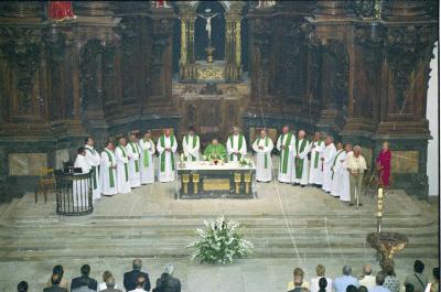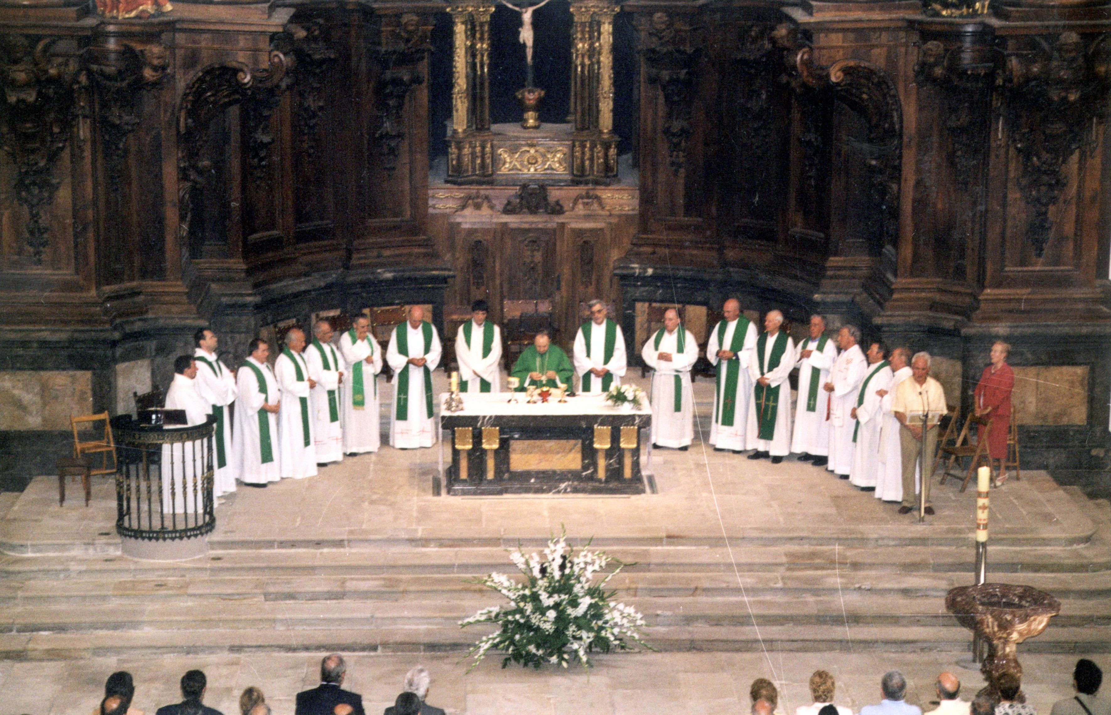 | Acto de apertura tras la restauración de la iglesia de Santa Marina: oficio religioso | " Oxirondoko Mariñe Donea Parrokia. BERGARA 2003-VII-20. Eliz barrutiko,Gotzaina den Juan Maria Uriarte buru dela Eliza Berzabaltzea eta bertan egin diren lanen Bedeinkapen Eukaristiko. OROIGARRIA." [mek. v.] |