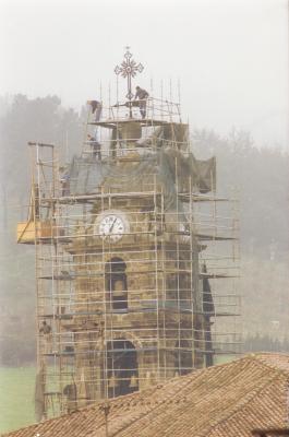Obras de reparación del campanario de la iglesia de Santa Marina: andamios obreros | VII-97 [ms.v.] |
