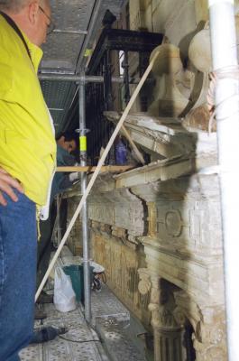 Reforma fachada casa Egino Mallea: dos hombres sobre andamio |