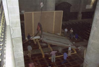Restauración de la iglesia de Santa Marina: trabajando con la grúa en el interior de la iglesia |
