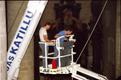 Restauración de la iglesia de Santa Marina: retirada del cuadro con grúa |