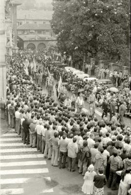 Celebración del centenario de la abolición de los Fueros: la calle Komenio abarrotada y desfile de representantes de los pueblos hacia la iglesia de San Pedro |