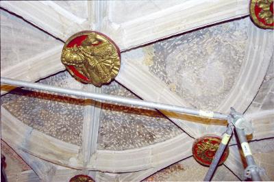 | Detalle de la bóveda de crucería de la iglesia de Santa Marina y pinturas rehabilitadas |