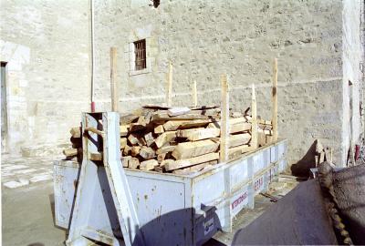 | Obras de reforma de la iglesia de Santa Marina: contenedor de madera en el exterior de la iglesia |