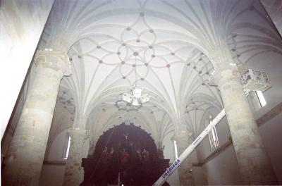 | Nave central de la iglesia de Santa Marina; grúa trabajando, bóveda de crucería y gloria del retablo mayor |