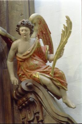 | Imagen del ángel de la derecha en el retablo mayor de la iglesia de Santa Marina |