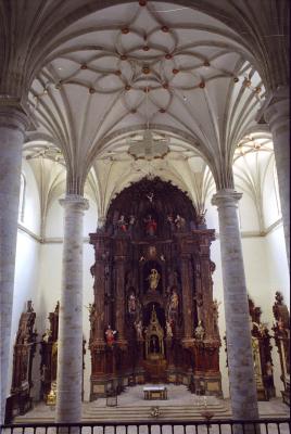 | Nave central de la iglesia de Santa Marina: bóveda de crucería y retablo mayor tras la restauración |