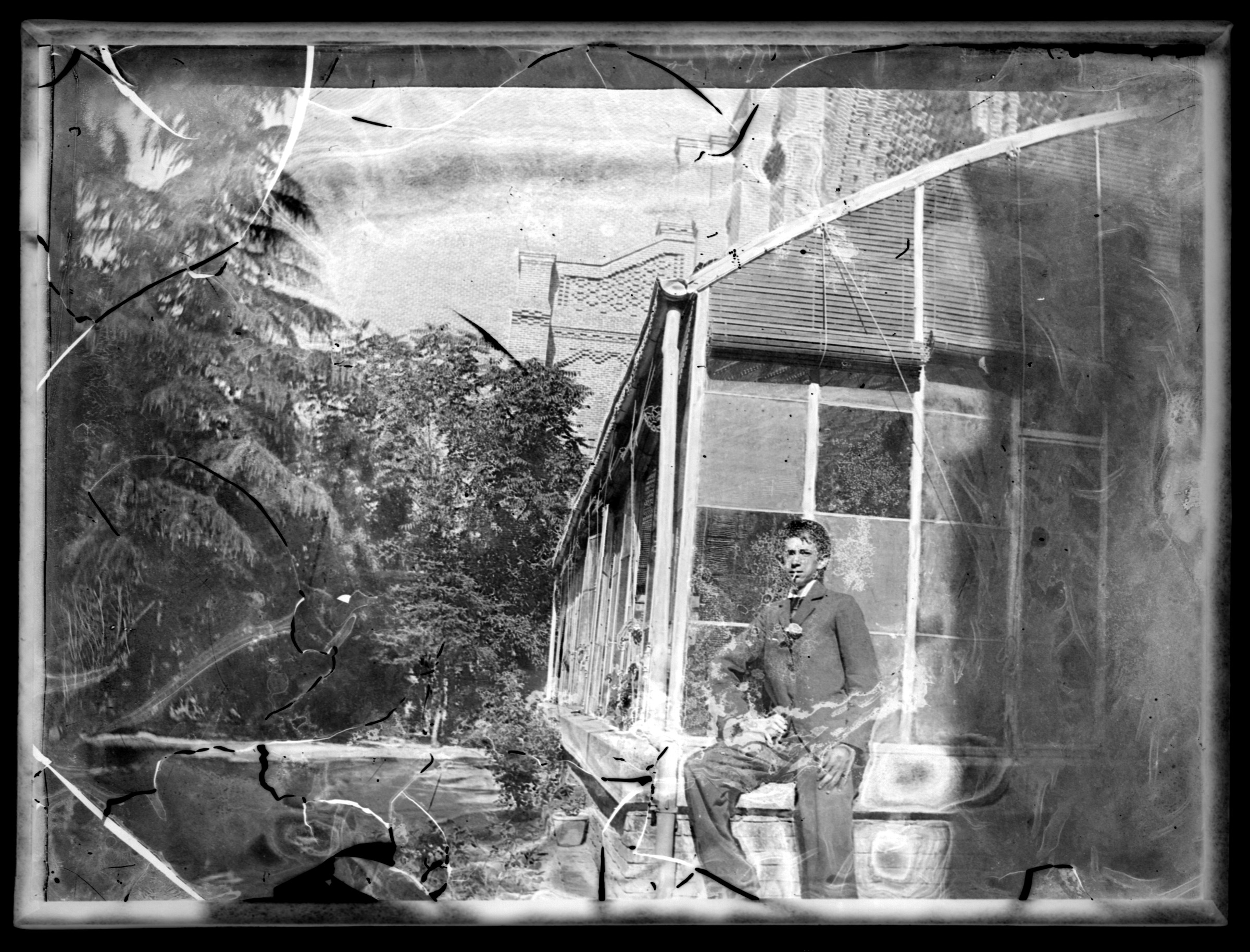 | Retrato de hombre con boina, fumando un cigarrillo y con una flor en el pecho; en su parte trasera se puede ver un edificio que parece una galería o invernadero |