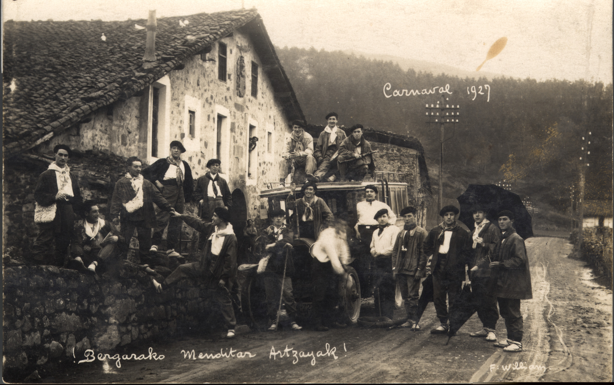 | Delante de un caserío un grupo de jóvenes y un coche. Llevan traje de casero y algunos instrumentos musicales. | "!Bergarako menditar Artzayak! Carnaval 1927" [ms. r .] |