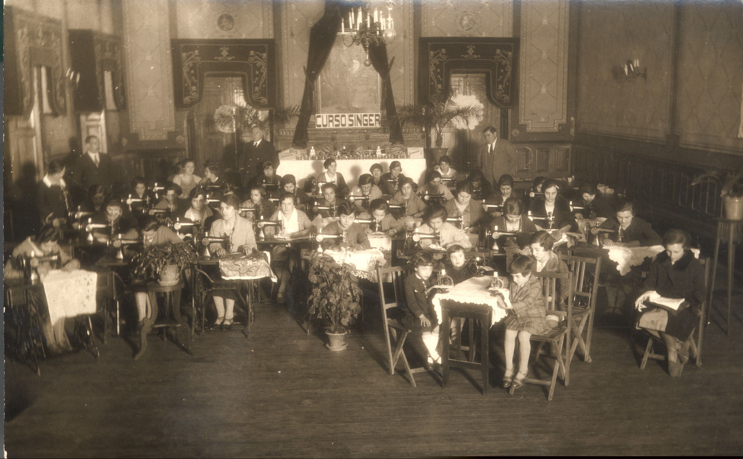 | Grupo de mujeres realizando el curso de máquinas de coser Singer en el Salón de Plenos del Ayuntamiento | Cursos Singer |
