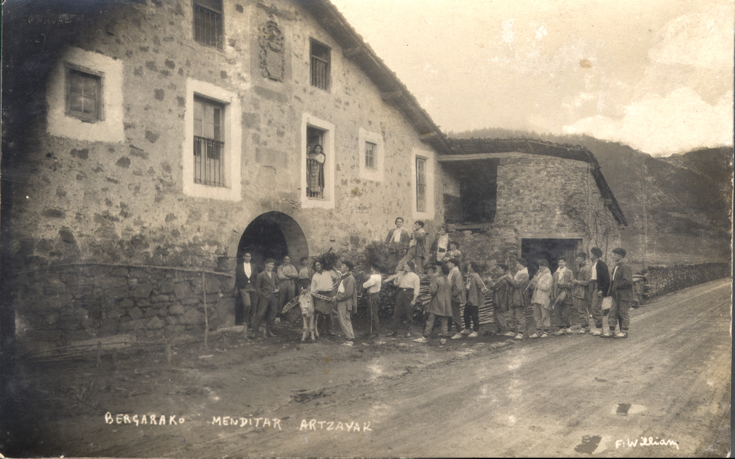 | Delante de un caserío un grupo de jóvenes y un burro. Llevan traje de casero y algunos instrumentos musicales. | !Bergarako menditar Artzayak! |