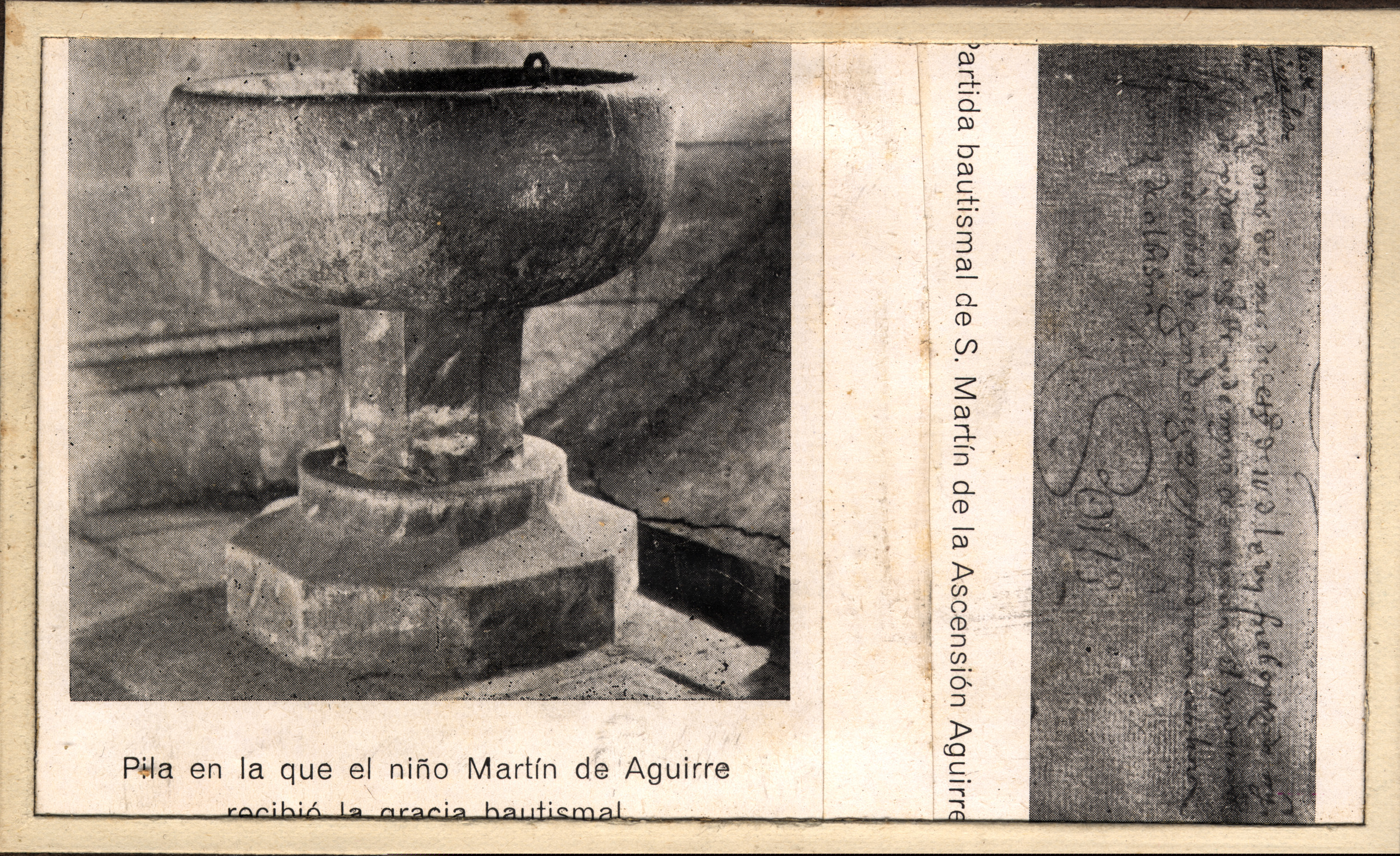 Imagen extraída de los libros de bautizos de la parroquia de San Pedro, en la que aparece el membrete de San Martín de Aguirre y la imagen de la pila bautismal de la parroquia de San Pedro utilizada para bautizar a San Martín. | "Pila en la que el niño Martín de Aguirre recibió la gracia bautismal" "Partida bautismal de S. Martín de la Ascensión Aguirre" |