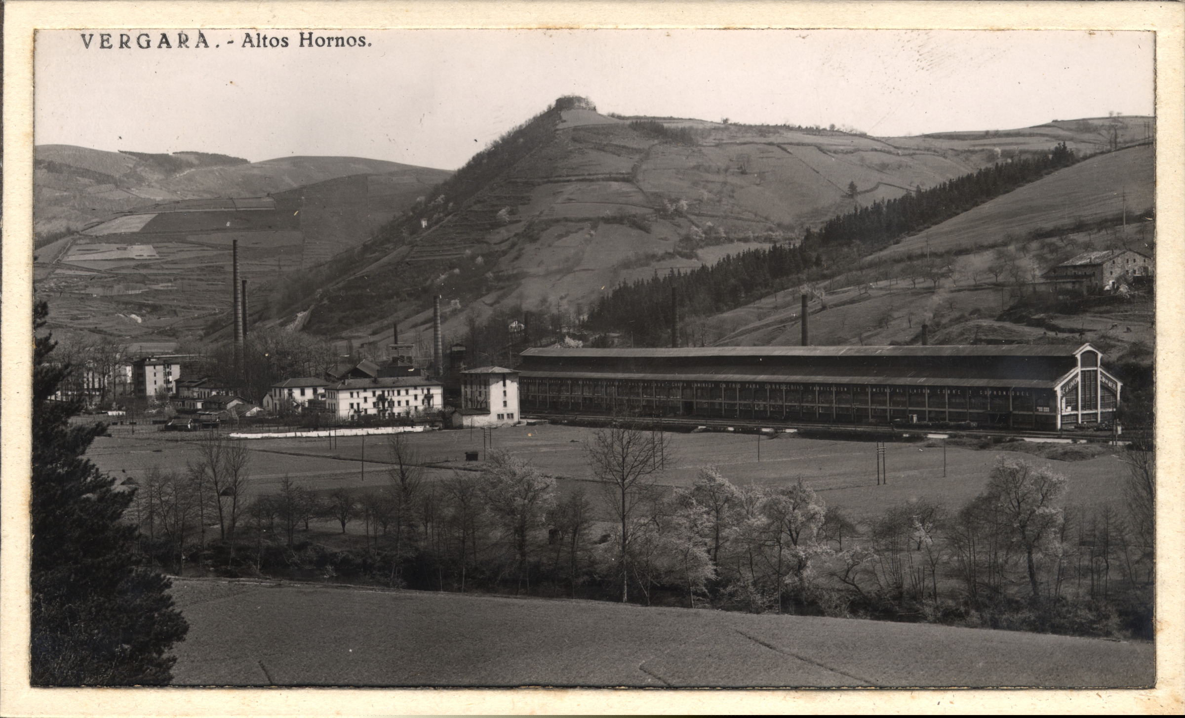 | Vista de Altos Hornos: instalaciones de Unión Cerrajera; Casa del Restaurante Zabala, al fondo San Miguel de Aritzeta | VERGARA. Altos Hornos [imp. r.] |