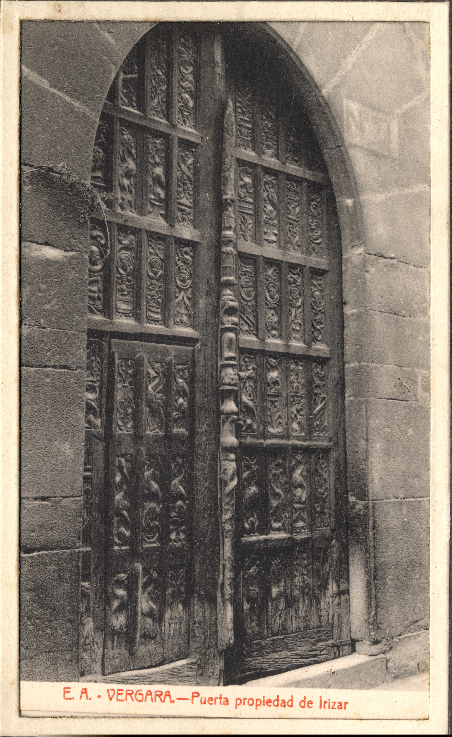 | Puerta trabajada de la casa Arostegi (siglo XVI) | E.A.- VERGARA. - Puerta propiedad de Irizar [imp. r.] |