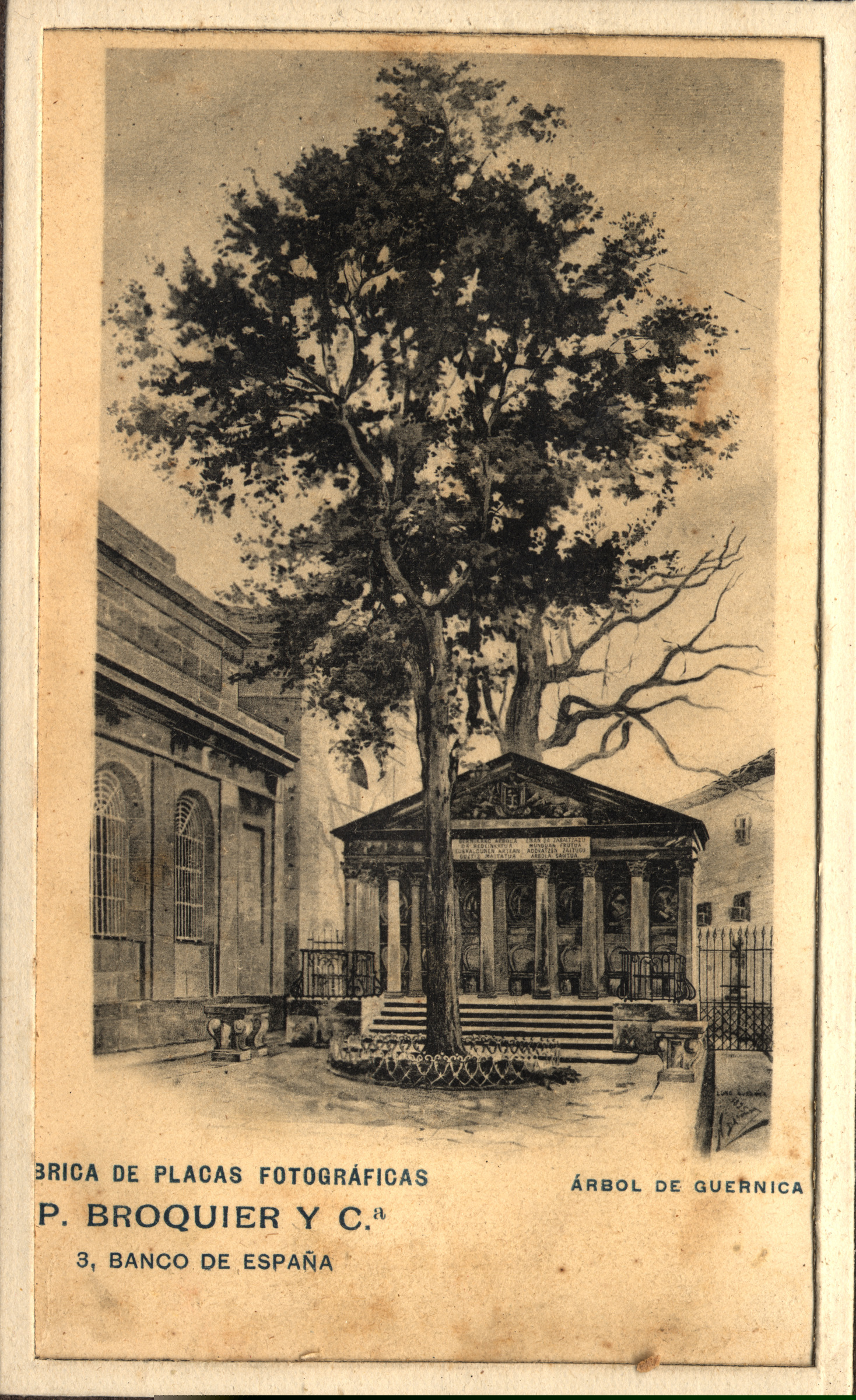 | Dibujo del árbol y casa de juntas de Guernica | FÁBRICA DE PLACAS FOTOGRÁFICAS - P. BROQUIER Y C.ª - 3, BANCO DE ESPAÑA - ÁRBOL DE GUERNICA [imp. r.] |