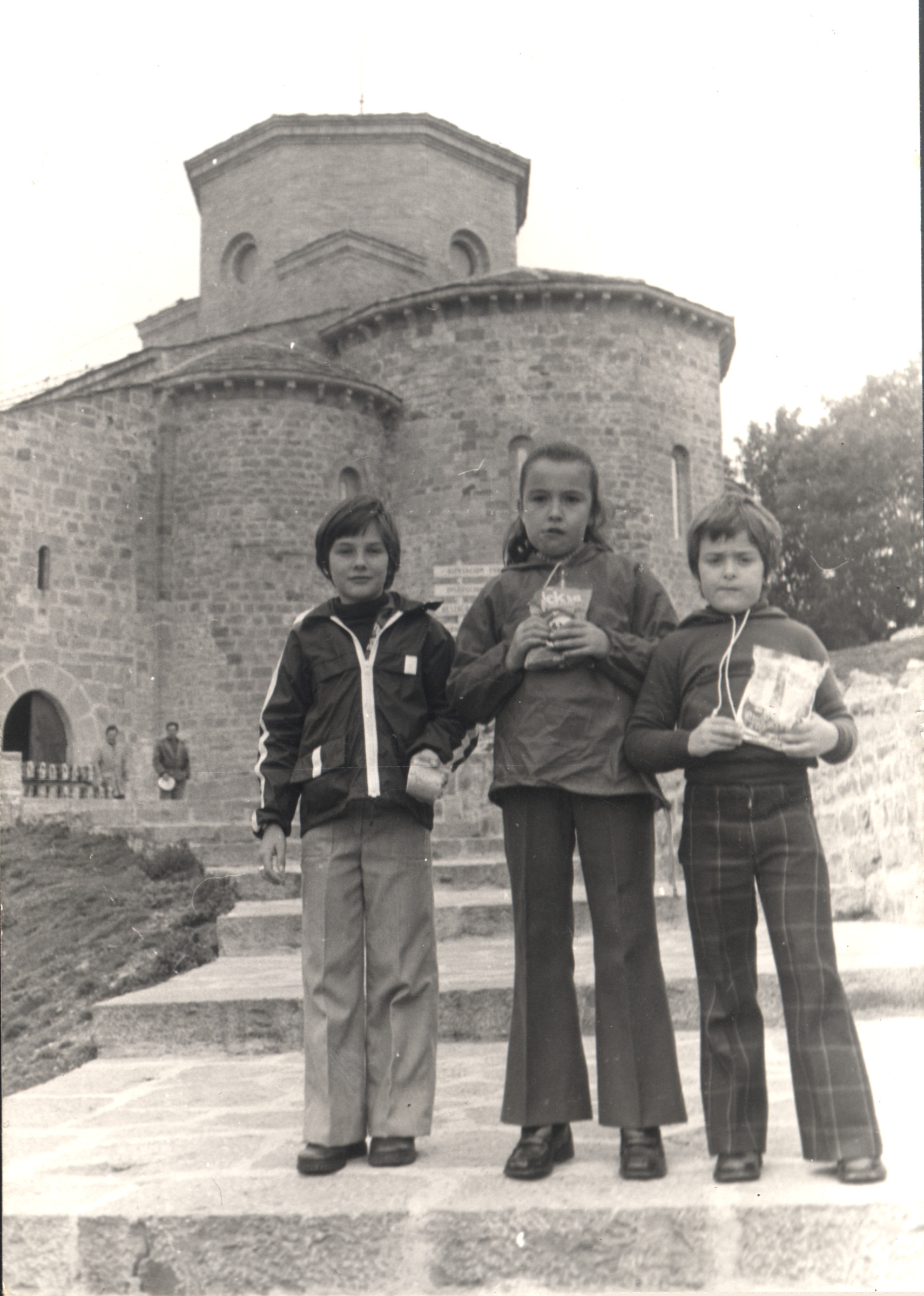 | Chicas delante del Santuario de San Miguel de Aralar |