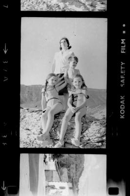 Retrato de familia: una mujer y tres niños niñas con traje de baño |
