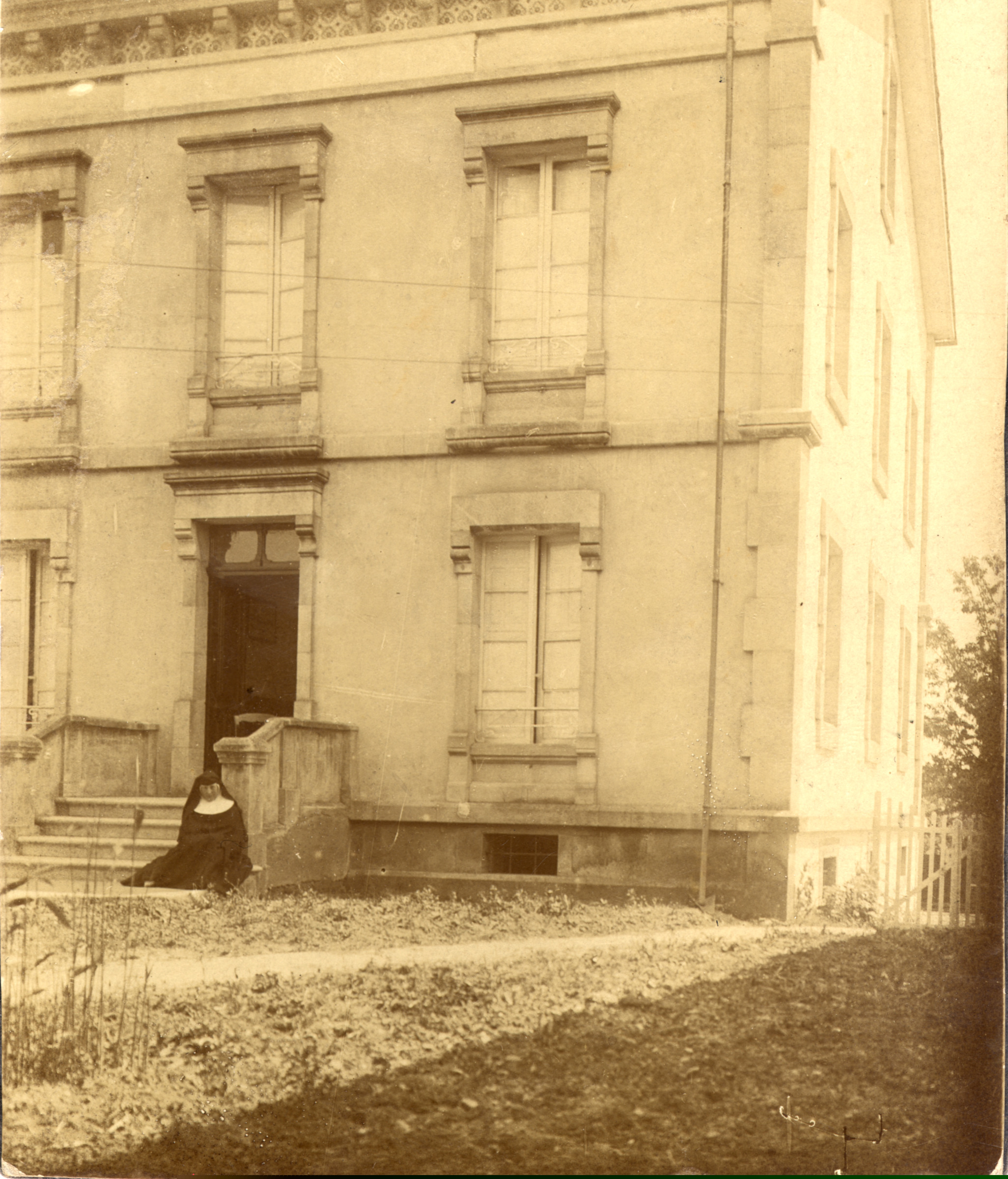 | Dos monjas en el convento, una sentada en las escaleras y la otra de pie |