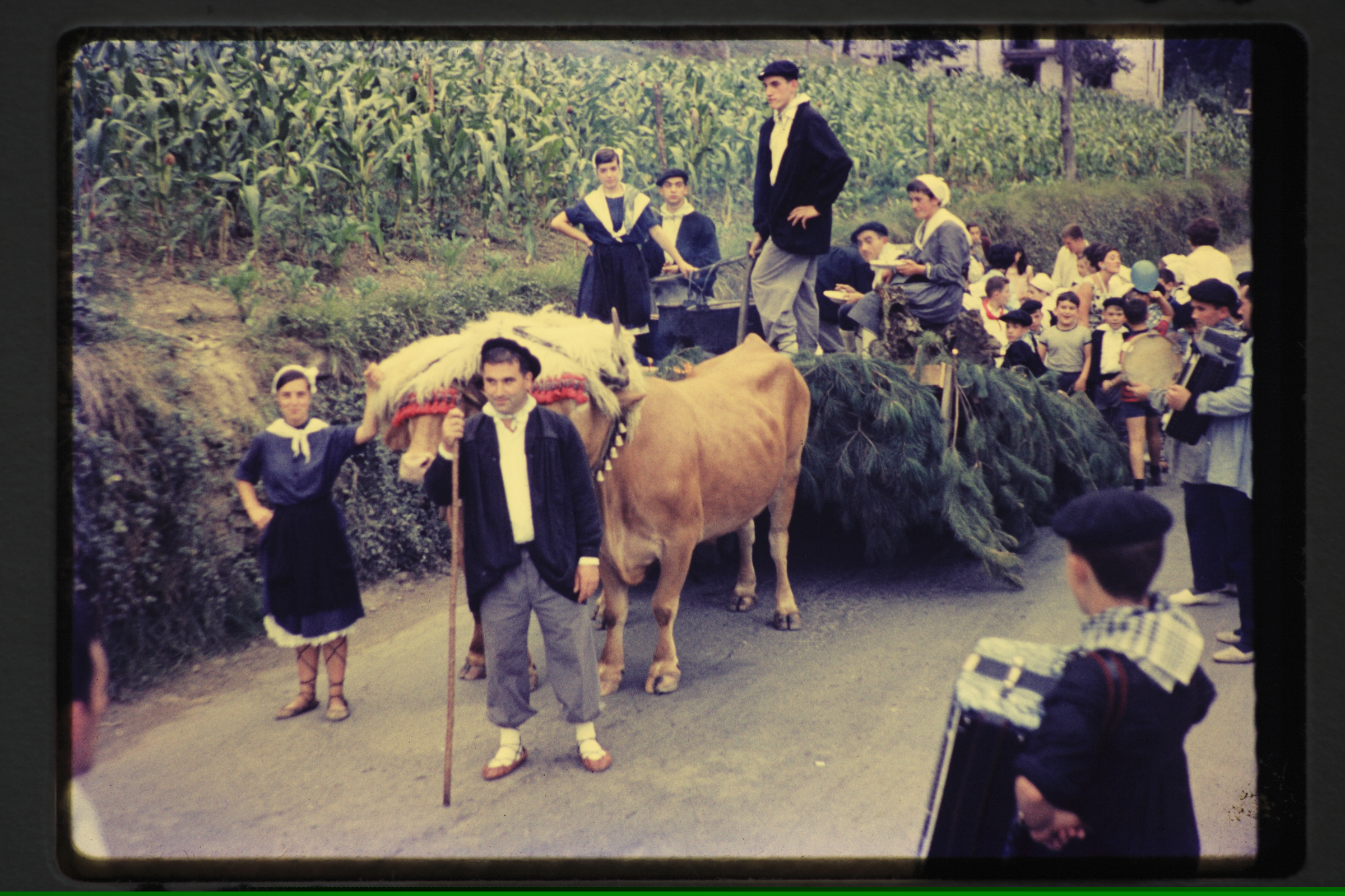 | Carroza festiva impulsada por el buey en Osintxu. Acordeonista en primer plano | 31-8-65 |