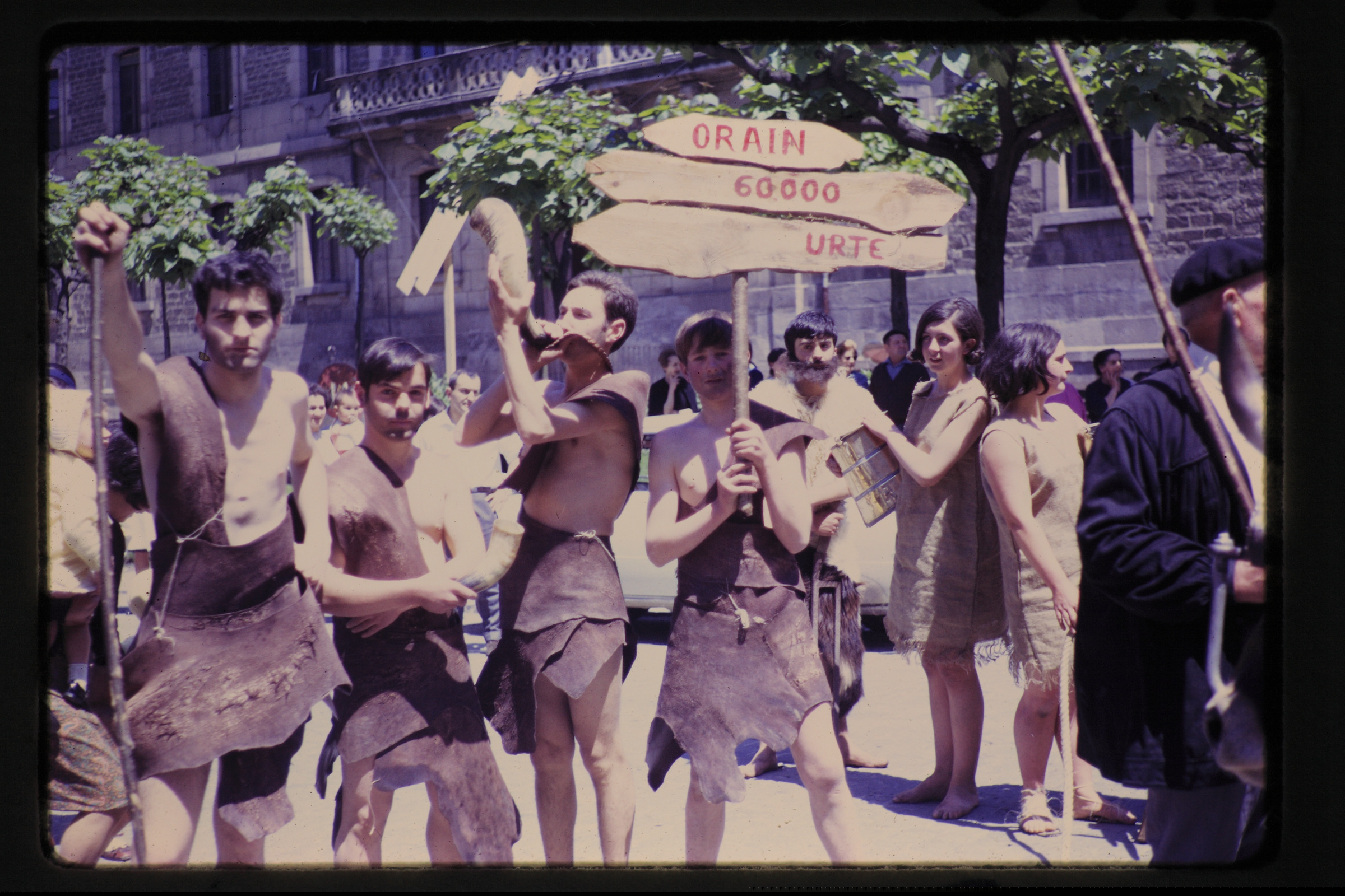 | Concurso de estampas de Pascuas: grupo troglodita, en la pancarta de madera que porta uno de ellos se lee "orain 60000 urte" | mayo-68 (ILEGIBLE) |