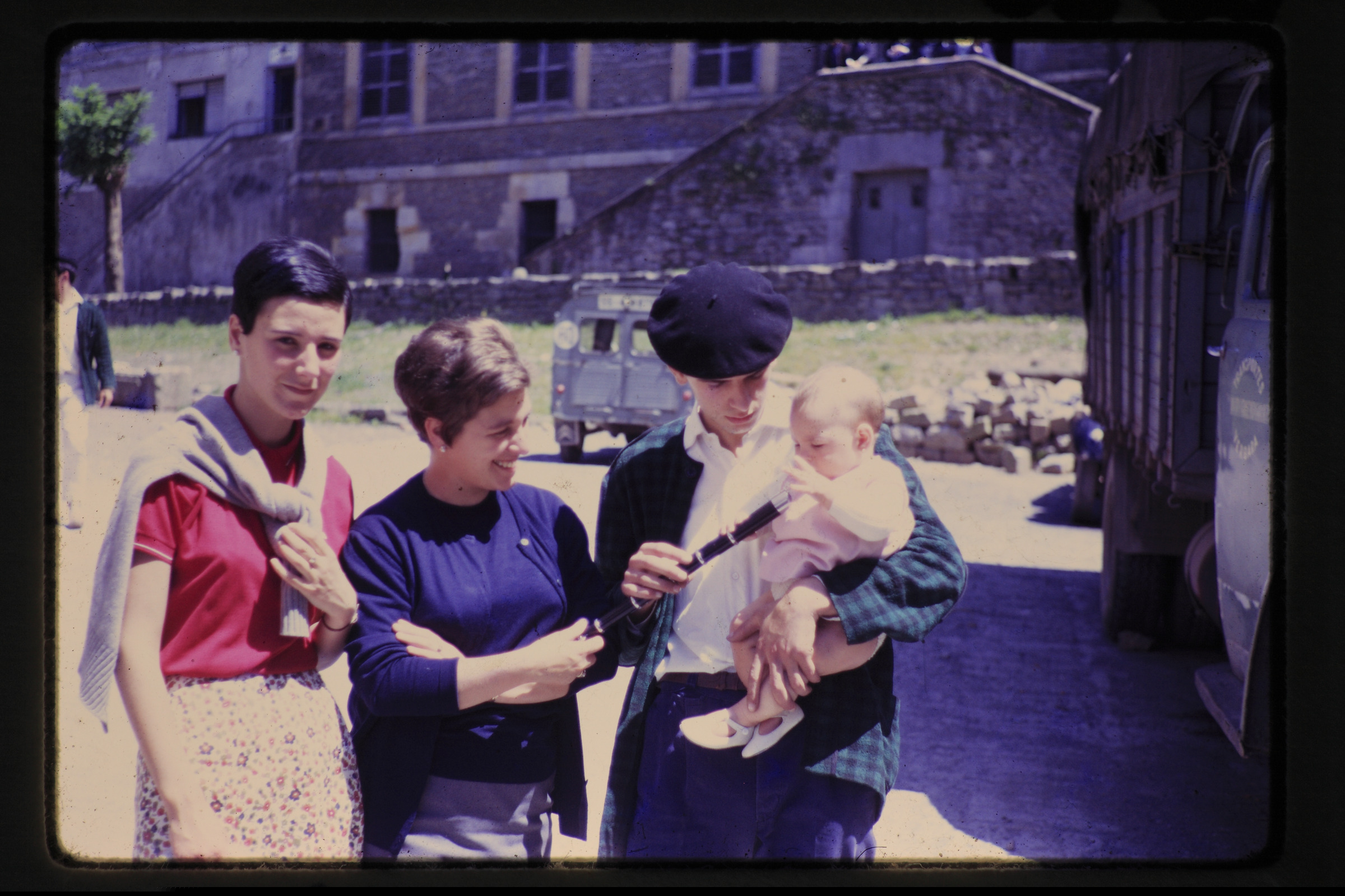 | Concurso de estampas de Pascuas: Txistulari con un bebé en brazos y retrato de dos mujeres en la calle Mizpildi | mayo-68 (ILEGIBLE) |