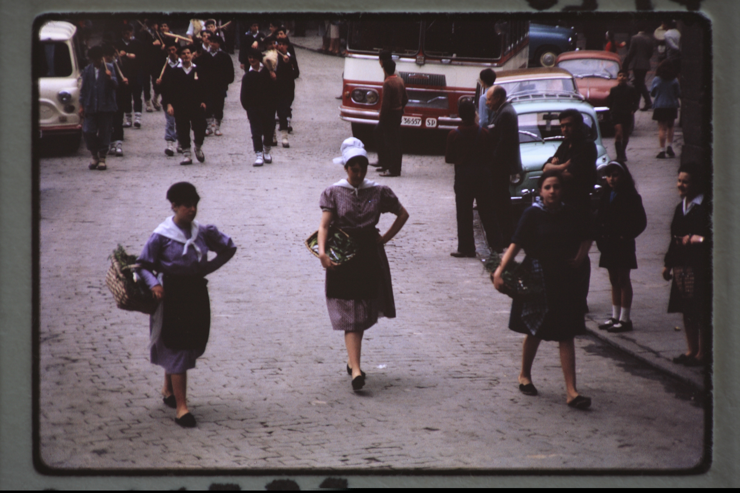 | Desfile de chicas vestidas de baserritarras en la plaza Ariznoa hacia Artekale. En el fondo los chicos vienen vestidos de campesinos. | mayo-67 |
