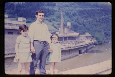 | Fiestas de San Antonio: Hombre con dos niñas delante de la Algodonera | junio 69 |