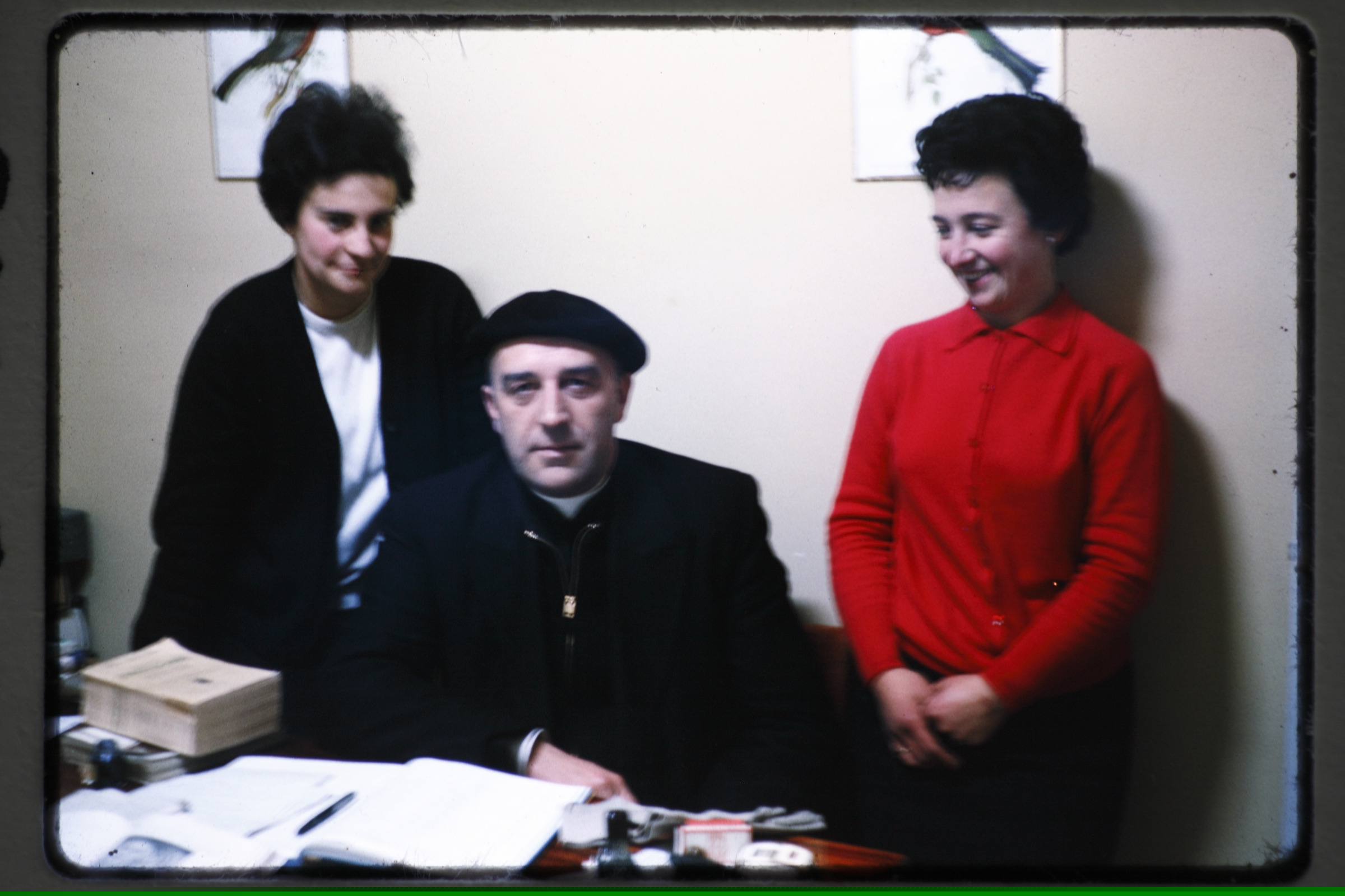| Rosario Igeregi, Carmen Gallastegi y Emiliano Iturraran en casa de Manolo Pildain. | 12-3-64 En casa de Manolo Peldain |