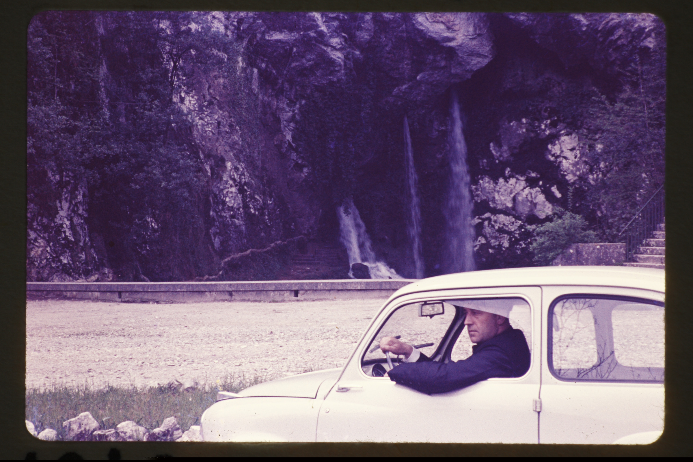 | Santuario de Covadonga: Emiliano Iturraran dentro del coche | 17-04-64 Covadonga |
