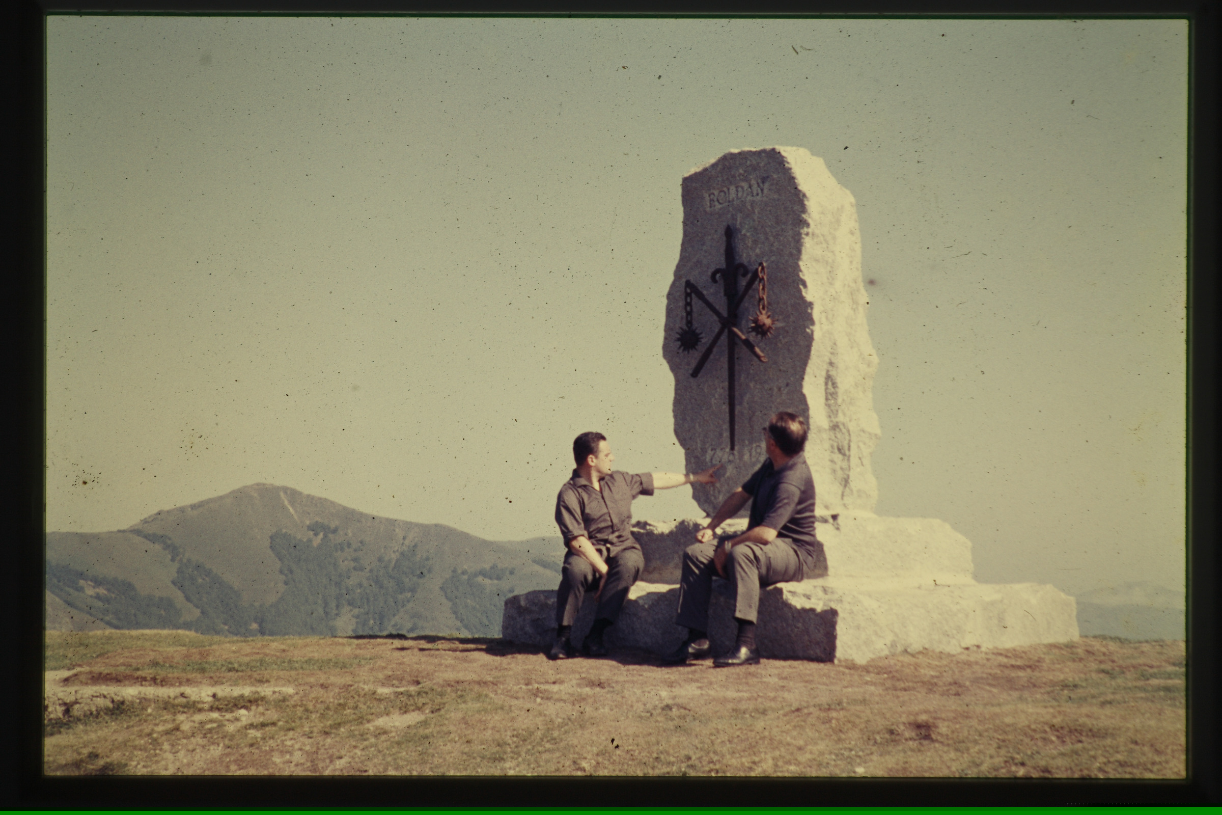 | Imanol Sorondo y José Etxeberria contemplan el monumento a Elorran | Agosto 68 |