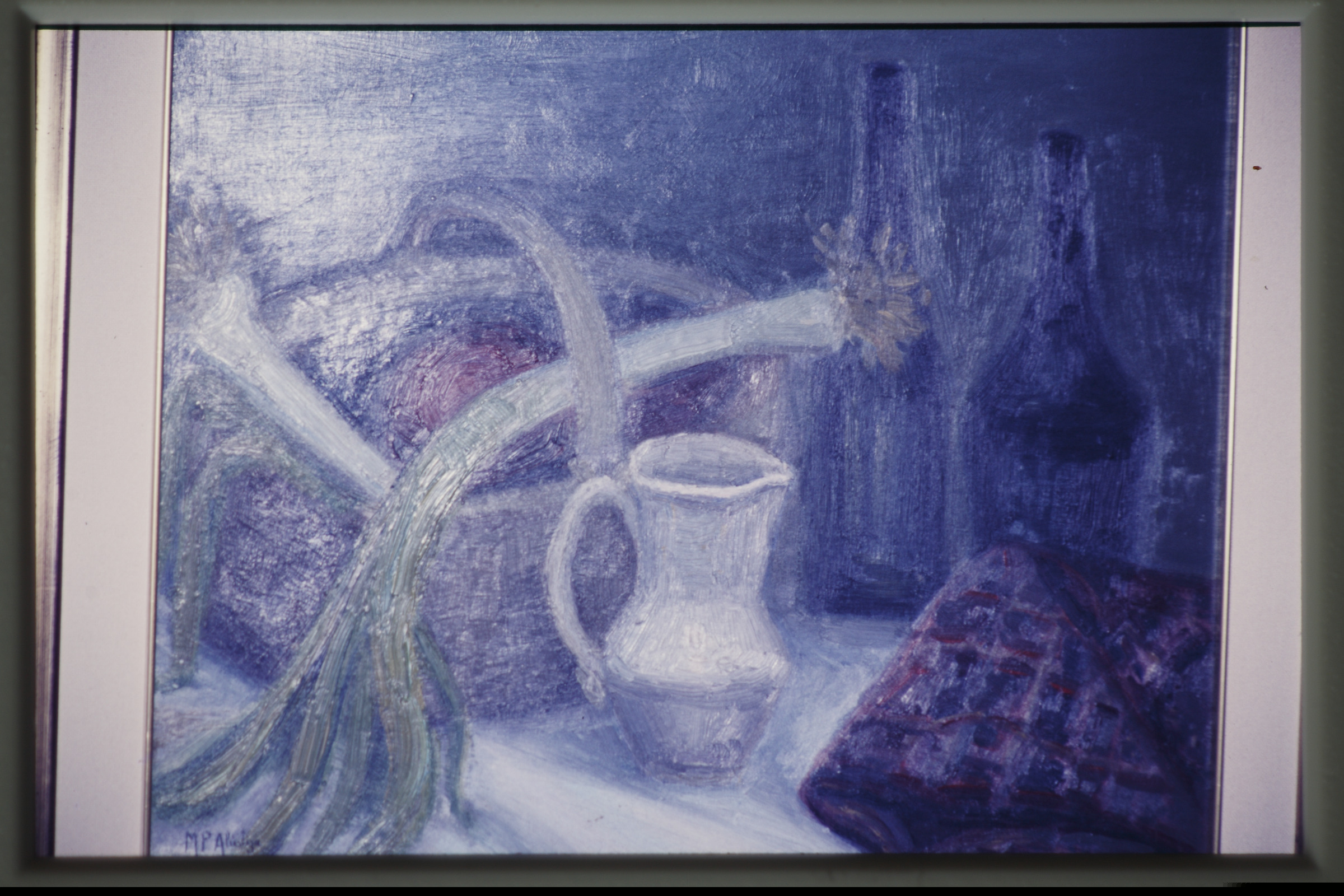 | Cuadro pintado por Mari Paz Alustiza: cesta de verduras y una jarra |