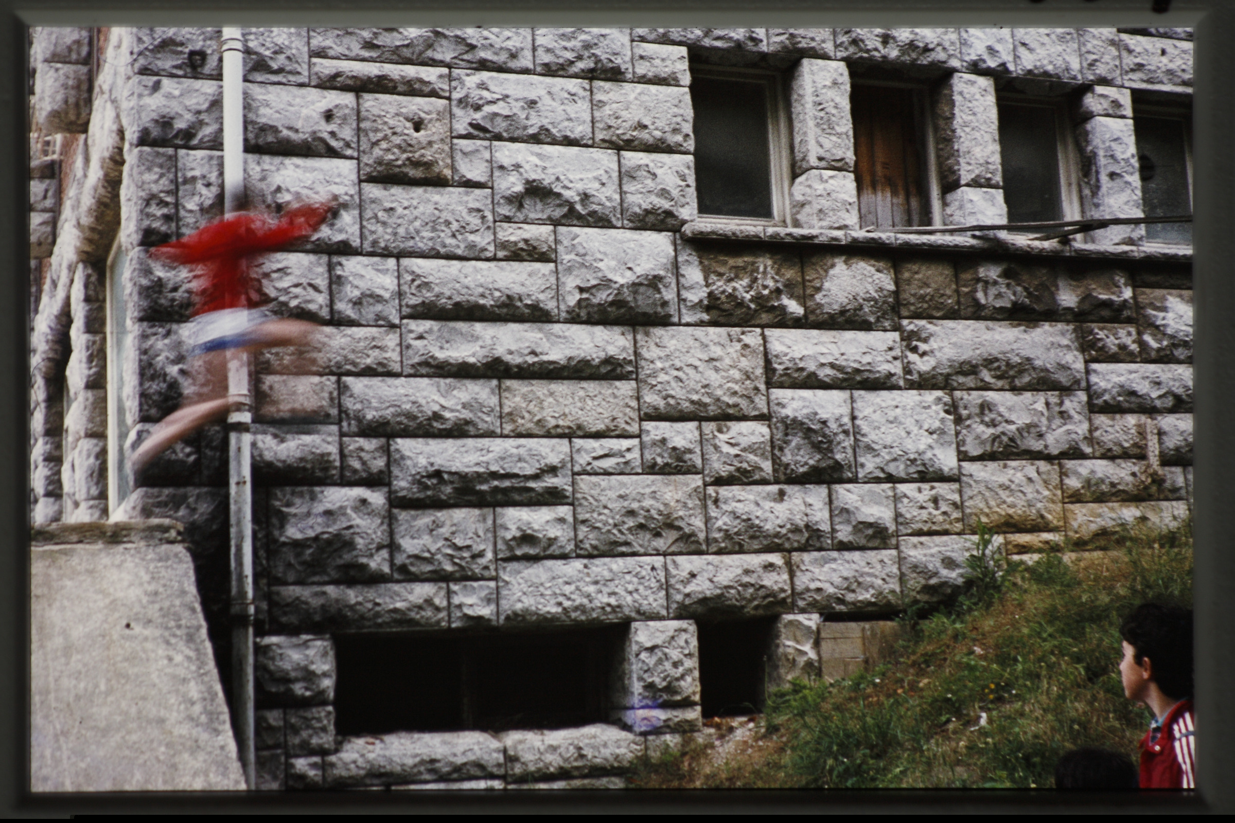 | Niños jugando junto a un edificio con ventanas muy pequeñas |