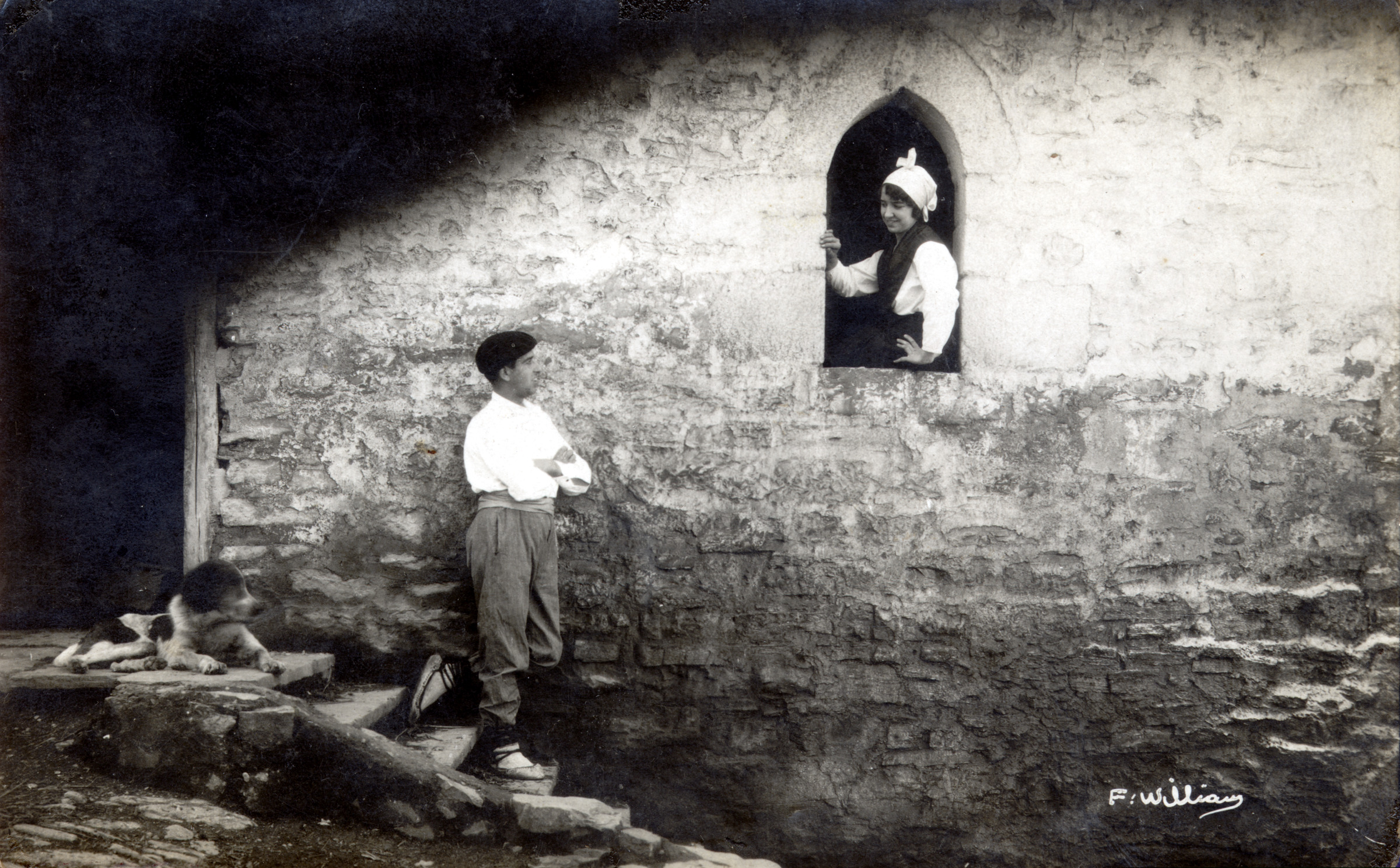| Una pareja y un perro en el caserío. La chica en la ventana y el chico en las escaleras, delante del perro, mirando a la chica | "F. Williams" [im. r.] |