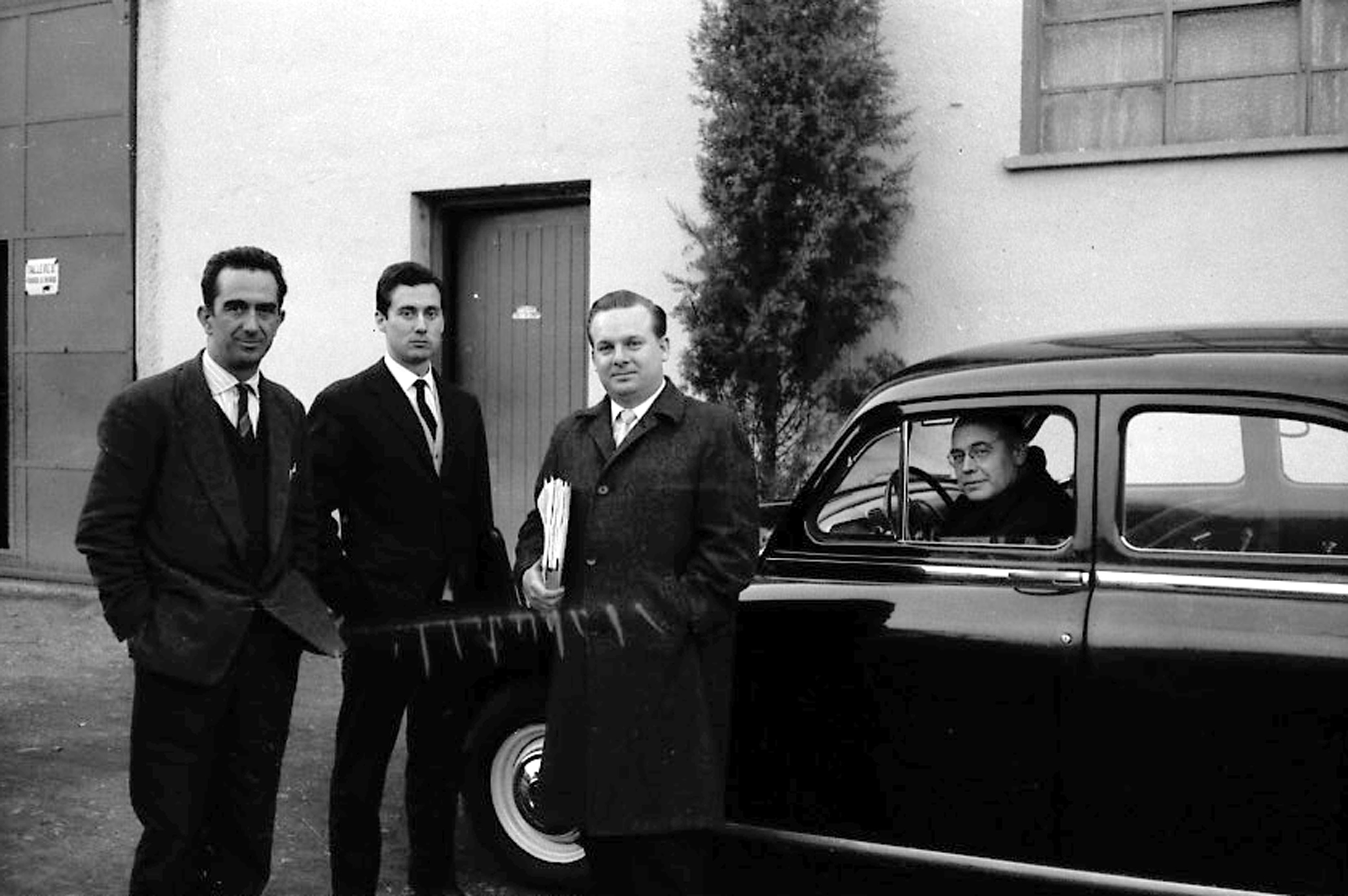 | Grupo de hombres frente a la fábrica. Un hombre está en el coche | --> ROCK EL YANKI 1963 10.jpg |